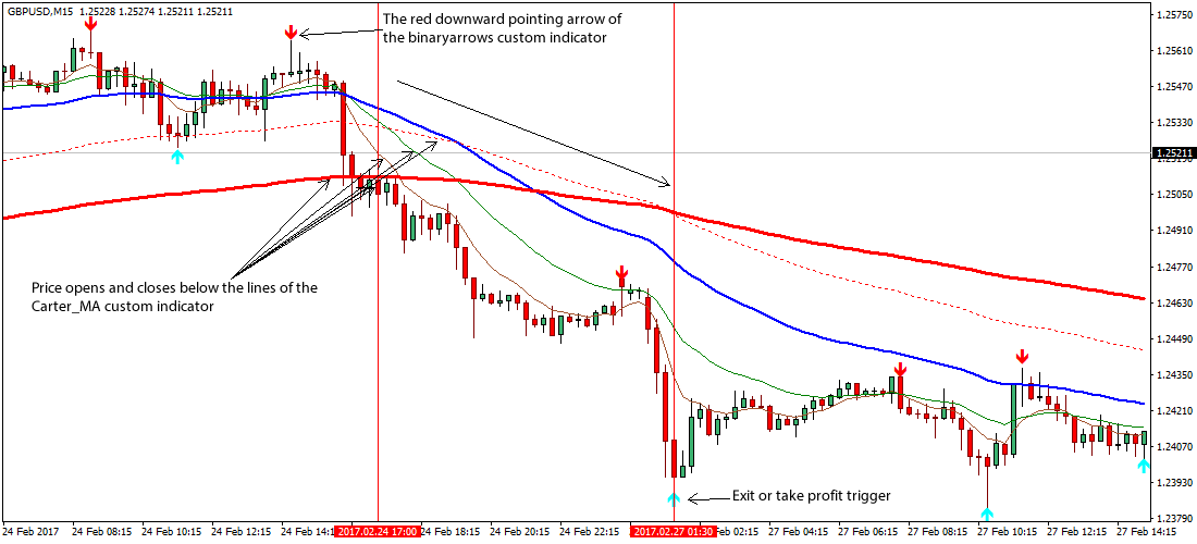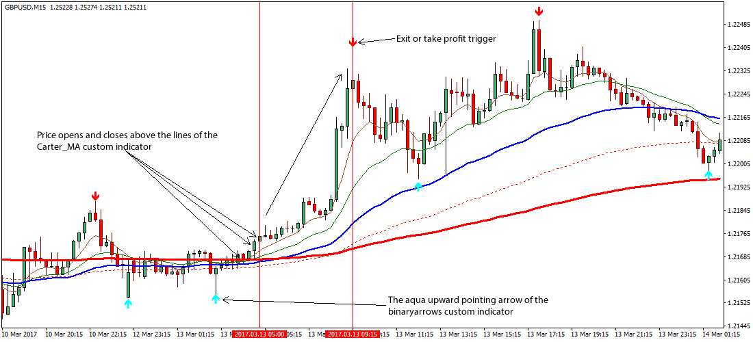 MetaTrader4 Indicators: Carter_MA.ex4 (default setting), binaryarrows.ex4 (default setting)