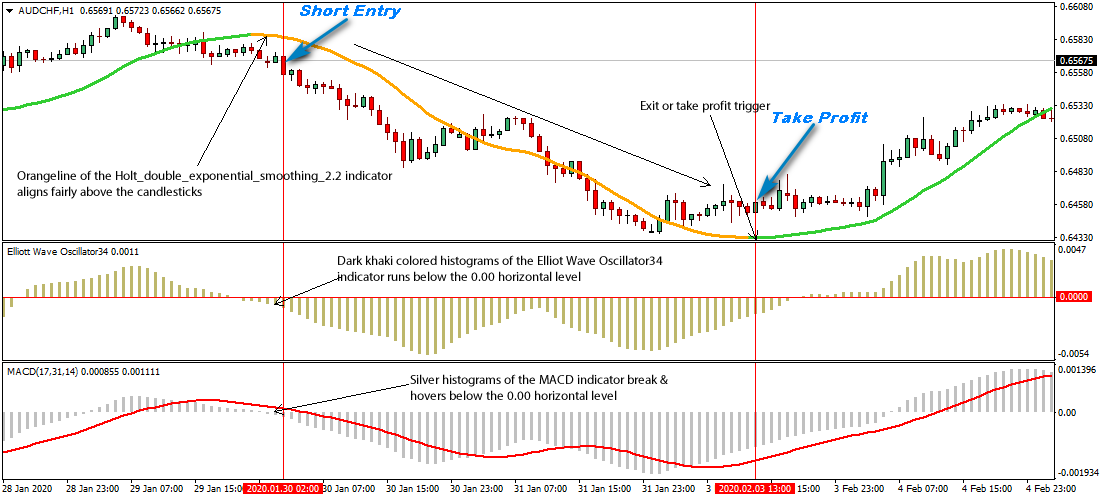 MetaTrader 4 Indicators: Holt_double_exponential_smoothing_2.2.ex4 (Inputs Variable Modified; Estimate period=28.66, Trend period=24.0), Elliot Wave Oscillator34.ex4 (Default Setting), MACD.ex4 (Parameters Modified; Fast EMA=17, Slow EMA=31, MACD SMA=14)