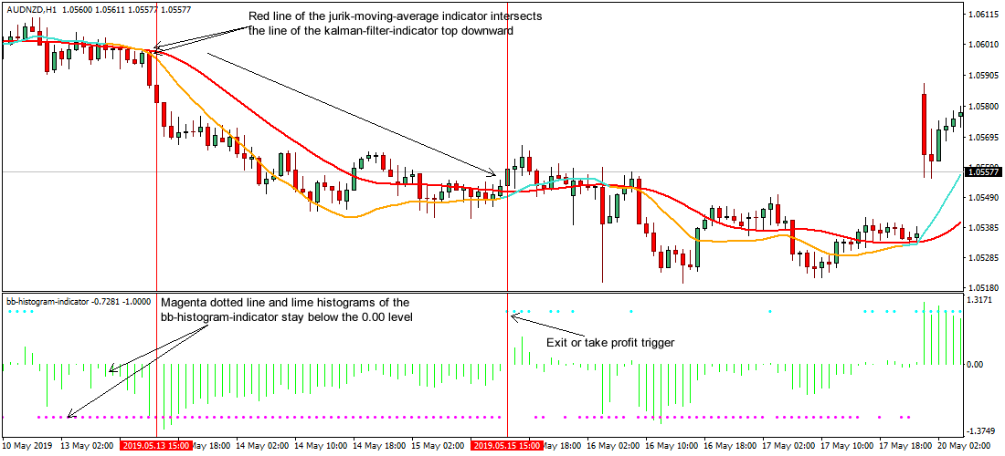 - If the red line of the jurik-moving-average indicator crosses the line of the kalman-filter-indicator during a bearish signal, bears power is said to be diminishing, therefore an exit or take profit is recommended.