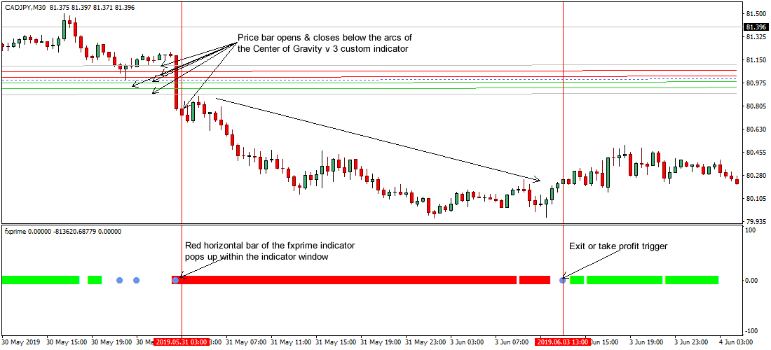 - If the price bar opens and closes below the arcs of the Center of Gravity v 3 custom indicator as demonstrated on Fig. 1.1, the market is said to be driving price lower, therefore a sell alert will do.
