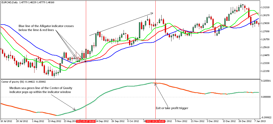 - If the orange red line of the Center of Gravity forex indicator pops up within the indicator window as seen on Fig. 1.1, the general market sentiment is said to be bearish, therefore a sell signal is said to be approaching.