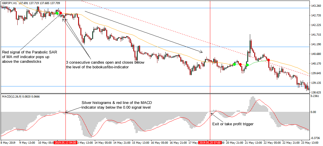 - If the red line of the MACD indicator dips below the 0.00 signal level, an exit or take profit stance is apt.