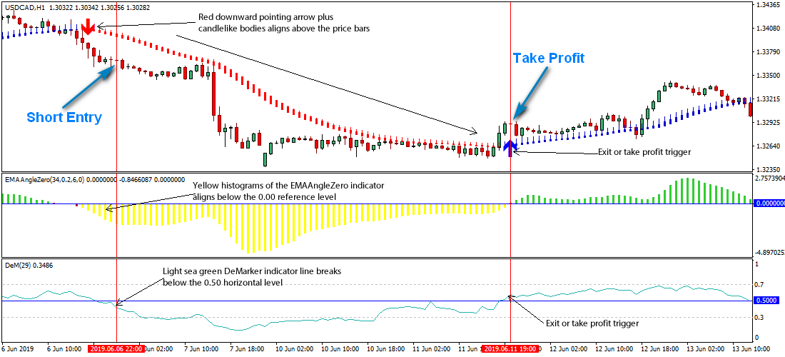 - If the EMAAngleZero custom indicator displays a fire brick or lime green histogram above the zero signal level, bears are said to be closing their positions more and more, hence an exit or take profit stance is suggested.